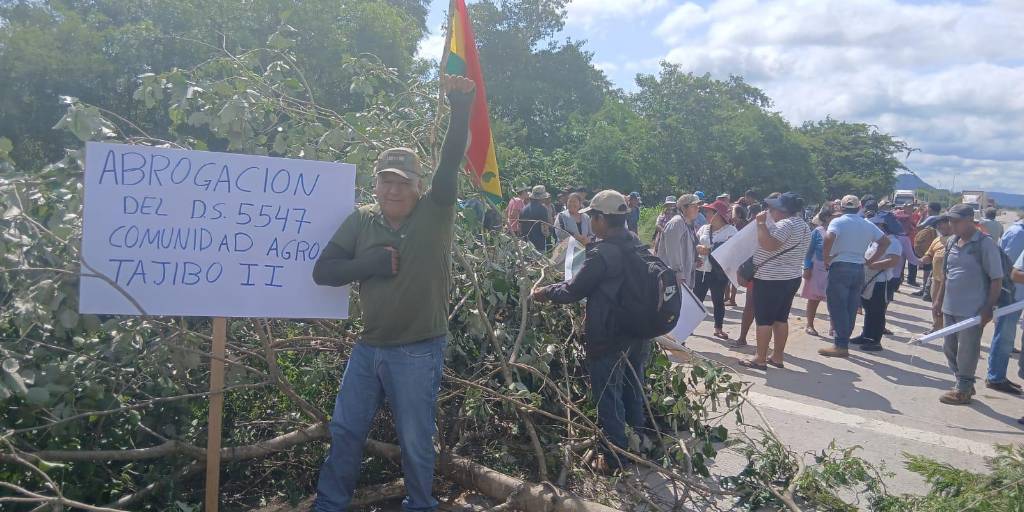 La protesta se originó tras un ampliado de emergencia de la Central Norte de San José de Chiquitos, que emitió un voto resolutivo en rechazo al Decreto Supremo 5547, que establece el arancel cero para la importación de soya.
