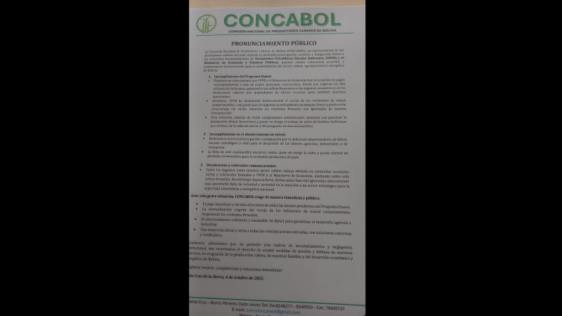 “Tanto los ingenios como nuestro sector cañero hemos enviado en reiteradas ocasiones cartas y solicitudes formales a YPFB y al Ministerio de Economía; sin embargo, hasta la fecha, dichas notas han sido ignoradas”, agrega el reporte.