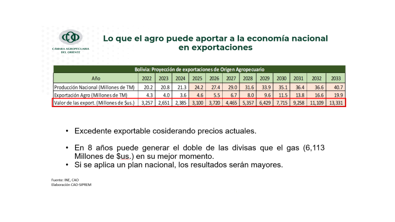 El ejecutivo resaltó que el gas, en su mejor momento, exportó $us 6.113 millones y el agro puede duplicar esa cifra para el 2033, tema que al Estado no le significará desembolso de recursos, potencial que no solo se da en Santa Cruz, sino también en otras regiones con vocación agrícola.
