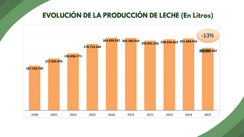 La producción lechera registró una producción de 262,5 millones de litros, cifra que implica una caída del 13% con respecto al año 2024. El año 2025 fue marcado por subida en los niveles de precio de los insumos, debido a un dólar paralelo cada vez más caro; el 95% de los insumos que requiere el sector son importados.