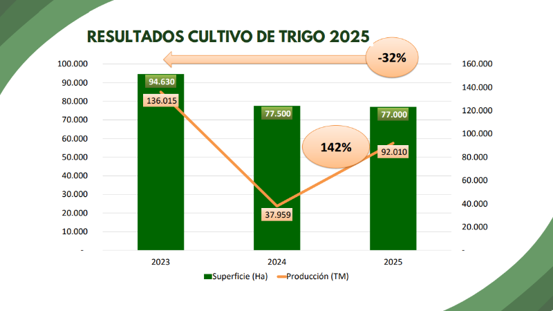 El área cultivada de trigo en la gestión 2025 fue de 77.000 hectáreas, una reducción de 0,65% comparado con la superficie sembrada en la gestión 2024 y un 18,63% comparado con la gestión 2023.