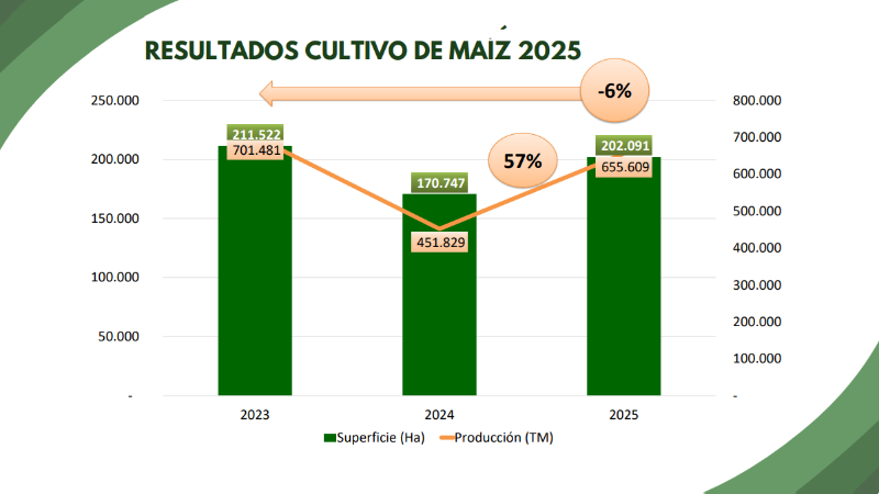 En la gestión 2025, la producción consolidada de maíz fue de 655.609 toneladas, registrando un aumento de un 45%, comparado con la gestión 2024 y una reducción de 7% comparado con la gestión 2023, es decir que la producción se ubicó por debajo de los niveles alcanzados en 2023.