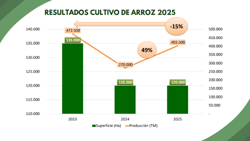 El cultivo de arroz en 2025 registra un área sembrada de 120.000 hectáreas, similar a la superficie de la gestión 2024 y una reducción de 11,11% comparado con el área sembrada en 2023.