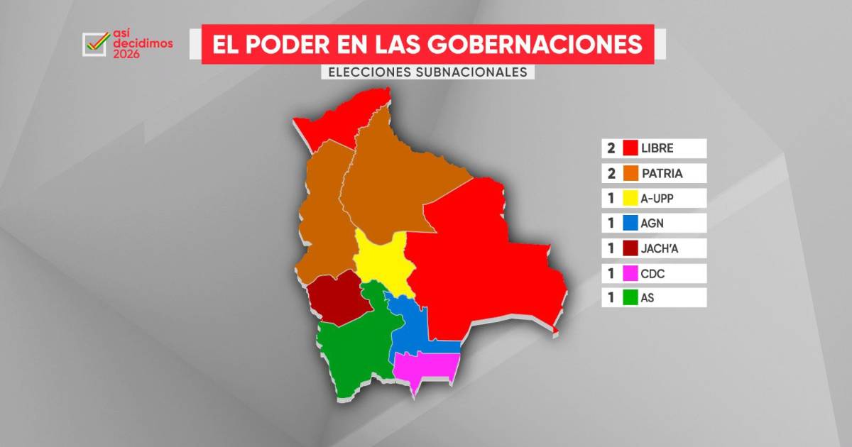 El resto del mapa se completa con la agrupación AGN en Chuquisaca, siendo el gobernador electo Luis Ayllón; Jacha en Oruro, con la victoria de Edgar Sánchez, y El Camino del Cambio en Tarija, con María René Soruco, configurando un escenario donde ninguna fuerza logra hegemonía nacional en el nivel departamental.