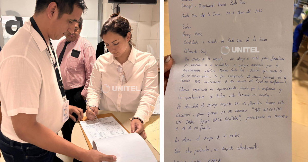 “Me dirijo a usted para formalizar mi renuncia a la candidatura a concejal municipal por la organización política Primero Santa Cruz, decisión que, como es de su conocimiento, le fue comunicada de manera personal en la reunión que sostuvimos el día 21 de enero”, reza la carta remitida a Gary Añez.