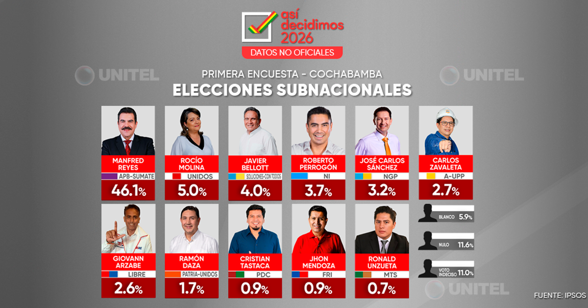 Unitel presentó la noche de este jueves la primera encuesta de intención de voto rumbo a las elecciones subnacionales 2026