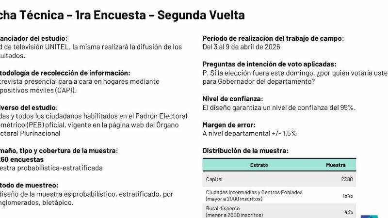 Para cumplir con los nuevos parámetros dispuestos por el Tribunal Supremo Electoral en las elecciones subnacionales, se realizaron 4.260 encuestas en el departamento de Santa Cruz, cubriendo la ciudad capital, las ciudades intermedias con más de 2.000 inscritos en el Padrón Electoral, y comunidades dispersas. Eso permite entregar resultados con una confiabilidad del 95% y un margen de error de 1,5%.