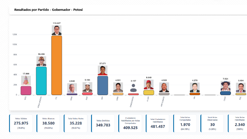 Este resultado es no oficial puesto que el Tribunal Electoral de Potosí (TED) de Potosí se hace cargo del cómputo de votos, que tienen un avance lento.