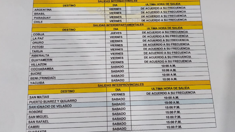 - Hacia Santa Cruz, Tarija y La Paz: Últimas salidas el sábado a las 11:00.