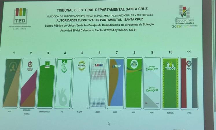 El Tribunal Electoral Departamental (TED) realizó el sorteo para la ubicación en la papeleta de las agrupaciones que disputarán la Gobernación de Santa Cruz. El 22 de marzo está fijado como el día de la votación para las subnacionales.