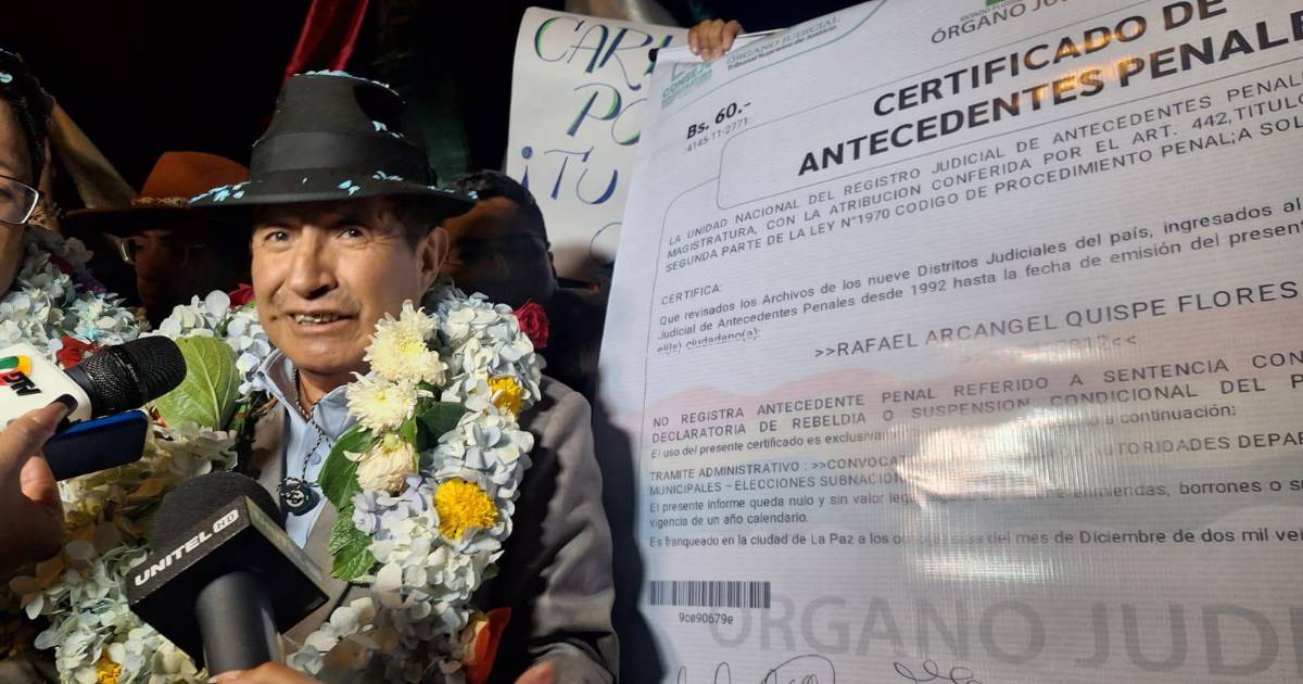 Con un certificado de antecedentes penales en mano, el exdiputado y exdirector del Fondo Indígena, Rafael Quispe, presentó su candidatura a la Gobernación de La Paz, por Unidad Cívica Solidaridad (UCS).