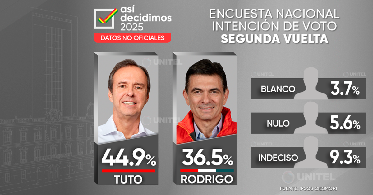 El estudio, realizado por Ipsos CIESMORI para UNITEL, también establece que la diferencia entre ambos creció a 8,4 puntos, superando los 7,7 puntos registrados en la primera medición; sin embargo, ambos candidatos han perdido apoyo respecto al primer sondeo.