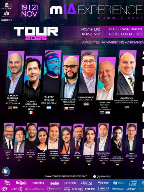 La Paz y Santa Cruz serán sede del evento más visionario de Latinoamérica, donde las mentes más brillantes del mundo en Inteligencia Artificial, Marketing, Finanzas y Negocios se darán cita para compartir conocimientos, estrategias y experiencias que marcarán el rumbo de la innovación en la región.