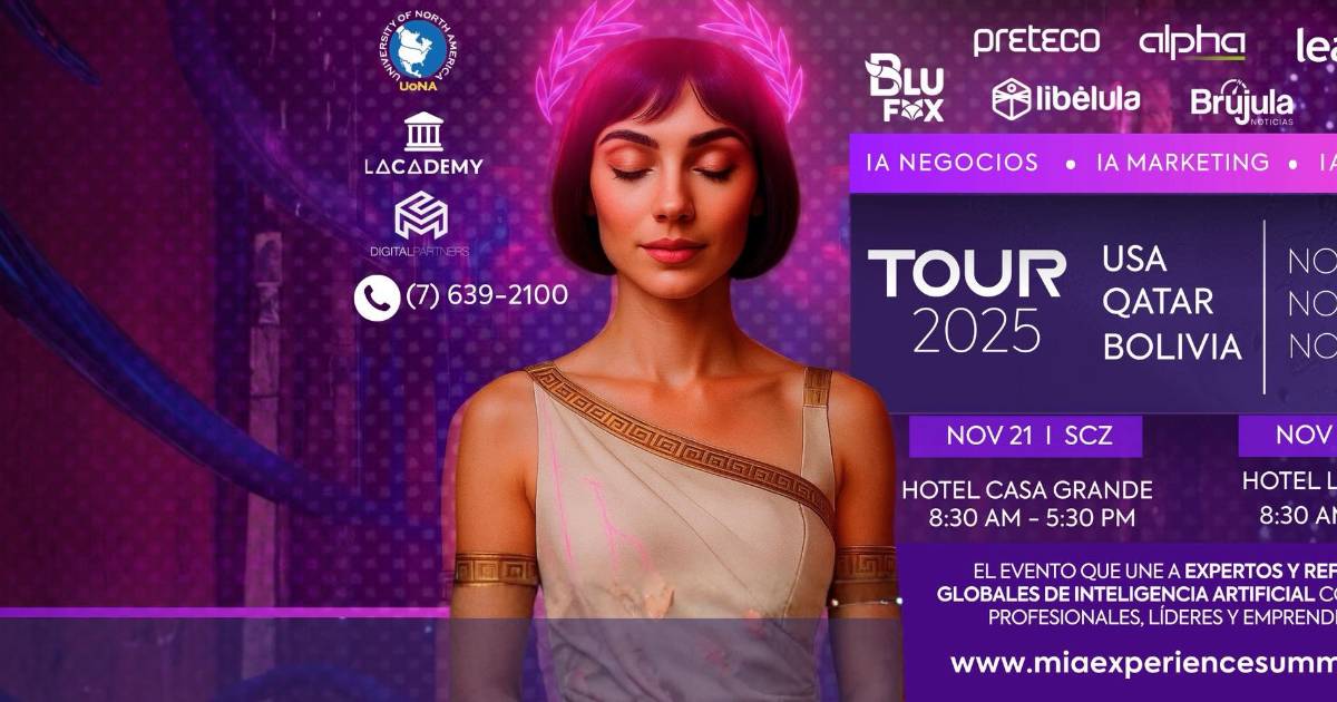 Después de su paso por Estados Unidos y Qatar, el MÍA Experience Summit Tour 2025 llega a Bolivia, reuniendo a expertos internacionales de Inteligencia Artificial aplicada a Educación, Negocios, Marketing y Finanzas en un evento que propone una nueva forma de entender el futuro del trabajo, la creatividad y la educación.