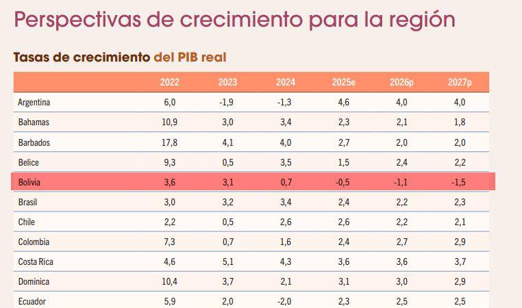 Ese documento también muestra que el único país que tiene un crecimiento por debajo de Bolivia el 2025 es Haití con -2,0%.