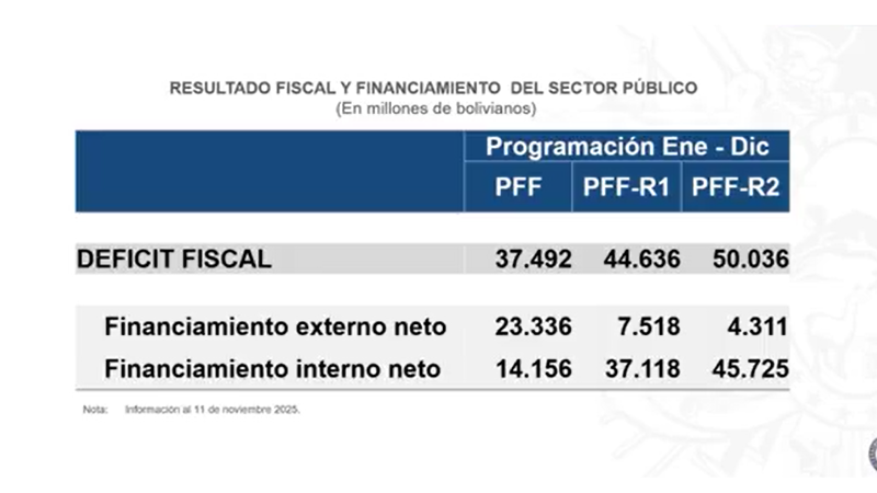 La autoridad remarcó que la proyección original de financiamiento externo, de Bs 23.336 millones, no se cumplió y cayó a Bs 4.311 millones, mientras que la necesidad de financiamiento interno se elevó de Bs 14.156 millones a Bs 45.725 millones para cerrar el año.