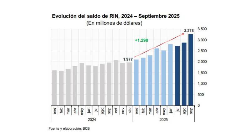 En comparación con el mes anterior, las reservas netas subieron en $us 393 millones, pasando de $us 2.881 millones al cierre de agosto a $us 3.275 millones en septiembre.