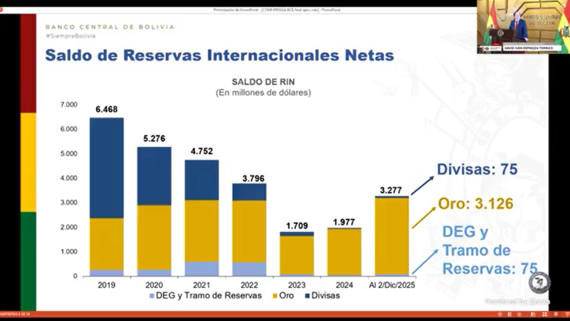 Según el Banco Central de Bolivia (BCB), las Reservas Internacionales Netas (RIN) registraron un saldo positivo de $us 3.277 millones al 2 de diciembre de 2025. De ese monto, solo $us 75 millones están en divisas.