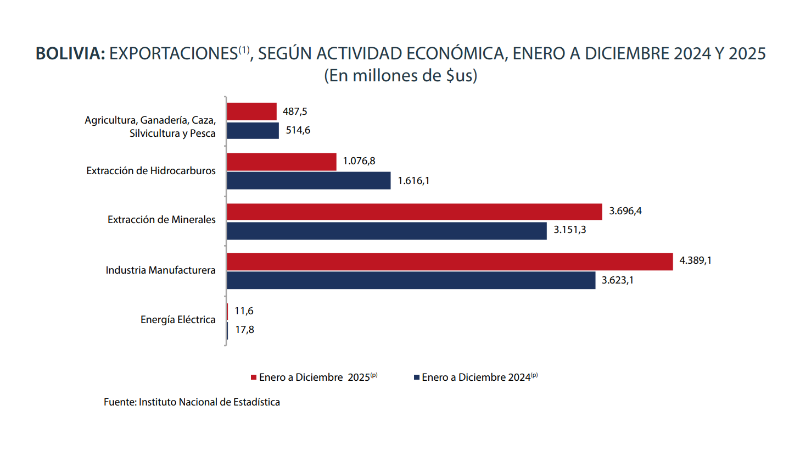 El reporte muestra que las exportaciones de minerales y de la industria manufacturera muestran un repunte, ya que en 2025 alcanzaron los $us 3.696,4 millones y $us 4.389,1 millones, respectivamente. Mientras que en 2024 la cifra llegó a $us 3.151,3 millones y $us 3.623,1 millones, respectivamente.