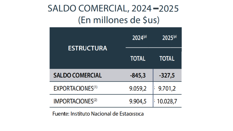 Si bien las cifras de 2025 son aún negativas, están lejos de los registros de 2024, cuando se registró un déficit comercial superior a los $us 845,3 millones, producto de $us 9.059,2 millones correspondientes a exportaciones y $us 9.904,5 millones de importaciones.