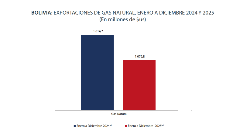 El informe refleja que, en el año 2025, las exportaciones del hidrocarburo alcanzaron los $us 1.076,8 millones, mientras que en el periodo 2024 la cifra fue de $us 1.614,7 millones, es decir, hay una caída en torno al 33%.