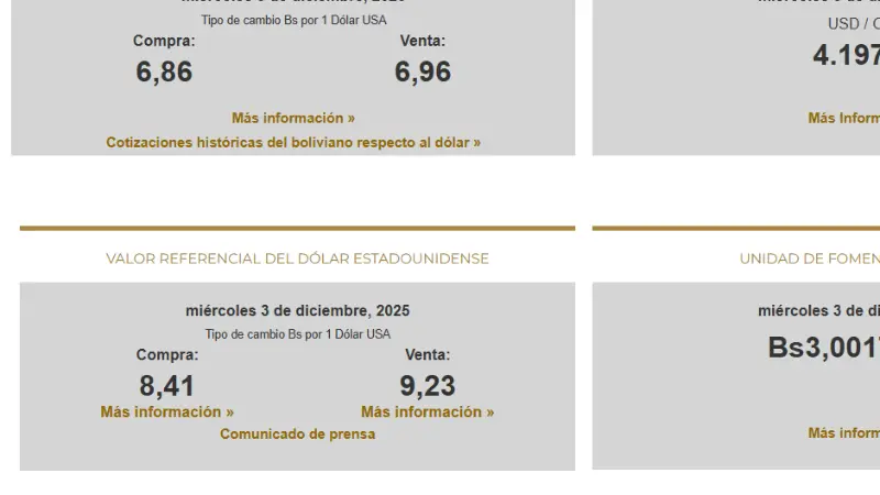Este es el valor referencial del dólar difundido por el BCB para las transacciones este miércoles 3 de diciembre