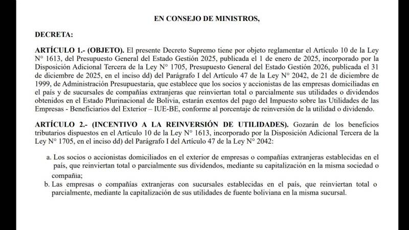 Según el decreto, las empresas que reinviertan total o parcialmente sus utilidades o dividendos obtenidos en Bolivia, estarán exentas del pago del Impuesto sobre las Utilidades de las Empresas - Beneficiarios del Exterior