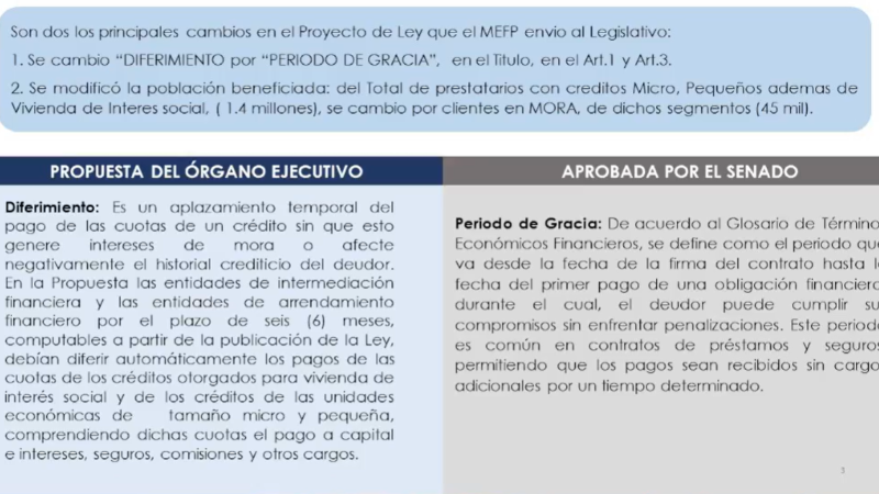 Efectivamente, en la sesión del Senado se mencionó que se ejecutaron “enmiendas”, por ejemplo, en el término de diferimiento por el de “periodo de gracia”.