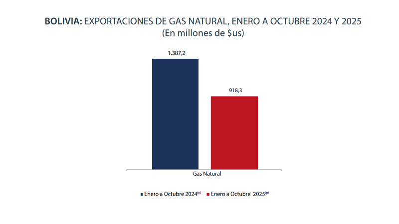 Según el desglose de la entidad estatal, entre enero y octubre de 2025, las exportaciones de gas en Bolivia alcanzaron los $us 918,3 millones, mientras que en el mismo periodo del 2024 la cifra fue de $us 1.387,2 millones.