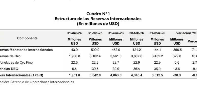 El Banco Central de Bolivia (BCB) informó este miércoles que las reservas internacionales se cifran hasta el 31 de marzo de 2026 en $us 3.612,5 millones, de los cuales $us 144,4 millones están efectivo y $us 3.432,2 millones son oro.