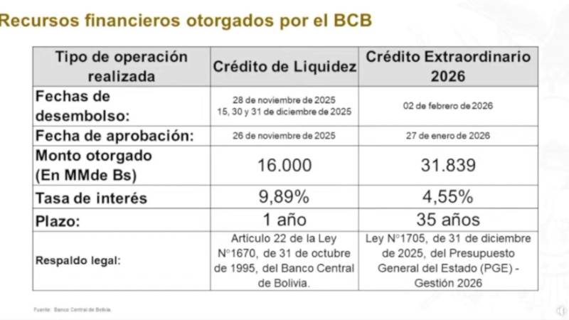 Posteriormente, el 27 de enero de 2026 se autorizó un crédito extraordinario por Bs 31.839 millones, con una tasa de 4,55% y un plazo de 35 años, según expuso Espinoza este jueves en la Cámara de Senadores en un informe oral impulsado por senadores de oposición.