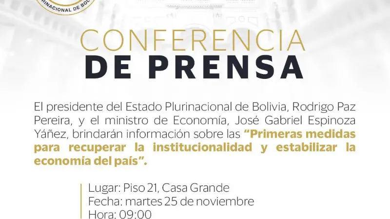 “El presidente del Estado Plurinacional de Bolivia, Rodrigo Paz, y el ministro de Economía y Finanzas Públicas, José Gabriel Espinoza, brindarán información sobre las “Primeras medidas para recuperar la institucionalidad y estabilizar la economía del país”, reseña la convocatoria.