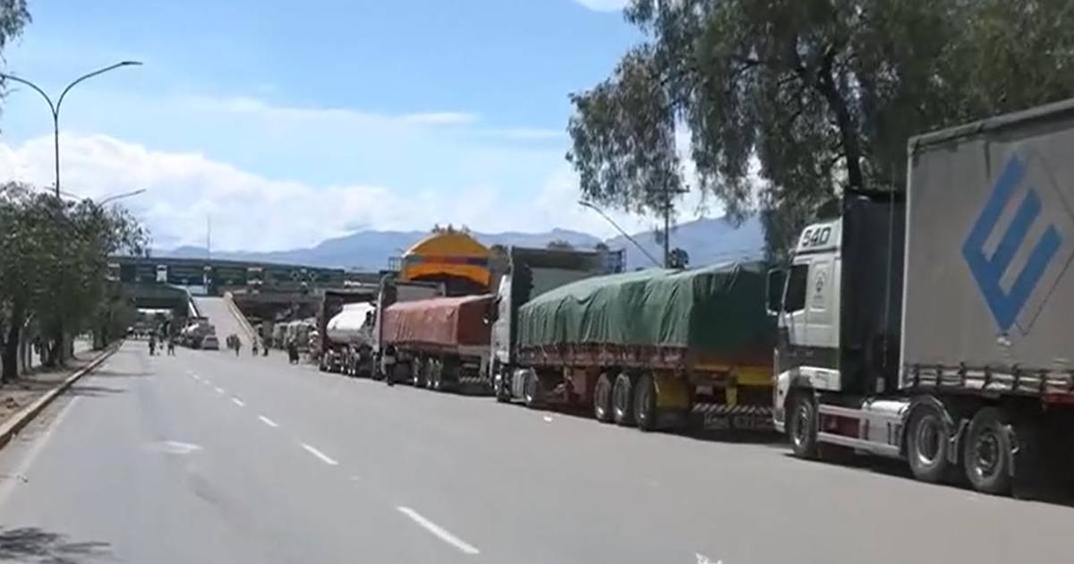 Una fila de camiones y vehículos de transporte pesado se registró este domingo en el kilómetro 2 de la avenida Blanco Galindo, en la ciudad de Cochabamba, donde los motorizados esperaban cargar diésel.