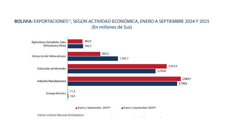 Respecto al sector industrial, hasta el tercer trimestre de 2025 se exportaron mercancías por valor de $us 2.884,7 millones, cifra mayor a los $us 2.790,6 millones anotados entre enero y septeimbre de 2024.