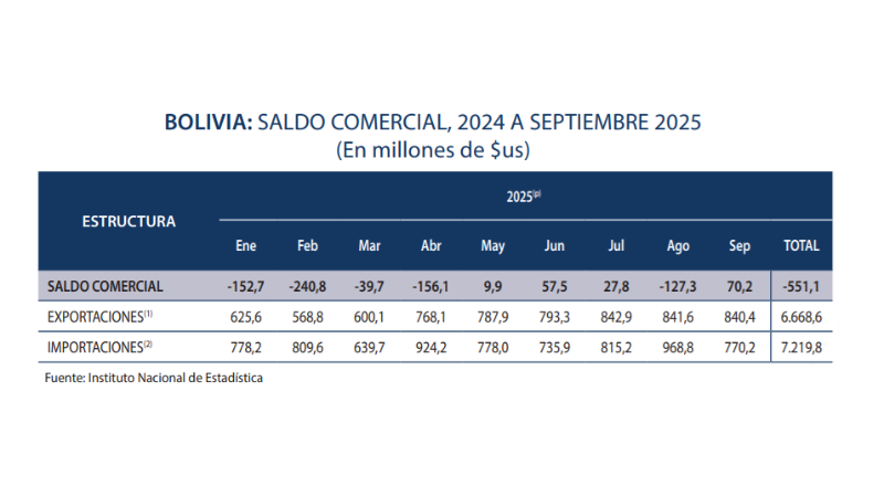 El Gobierno de Luis Arce Catacora dejó un déficit comercial de $us 551,1 millones entre enero y septiembre de este año en términos de valor, de acuerdo con el reporte de comercio exterior del Instituto Nacional de Estadística (INE).