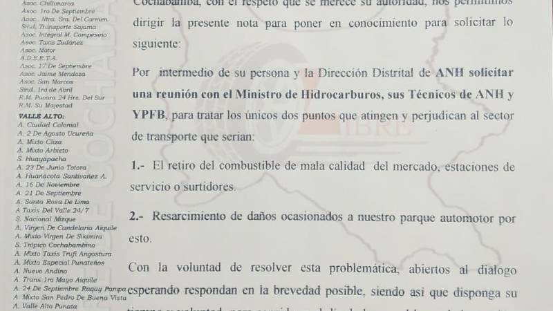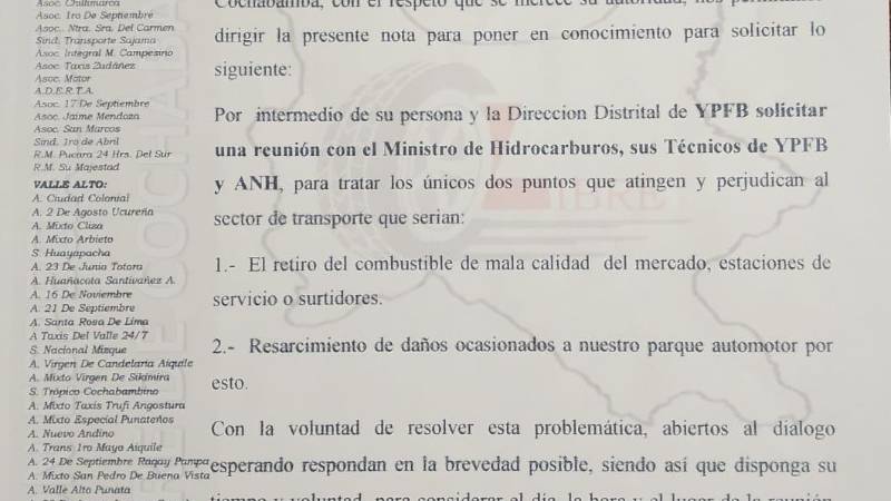 “Por intermedio de su persona y la dirección distrital de YPFB solicitar una reunión con el ministro de Hidrocarburos, sus técnicos de YPFB y ANH para tratar los únicos puntos que atingen y perjudican al sector del transporte”, expresa el documento.