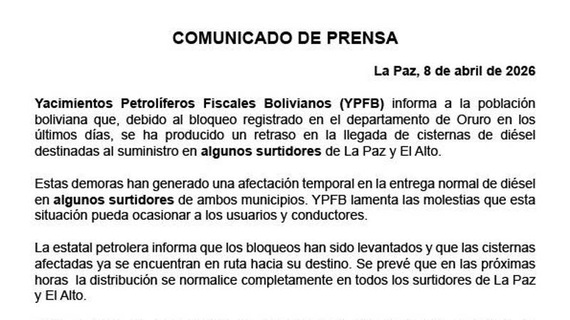 “Se prevé que en las próximas horas la distribución se normalice completamente en todos los surtidores de La Paz y El Alto. YPFB reitera su compromiso de garantizar el abastecimiento oportuno de combustibles”, se añade en el documento.