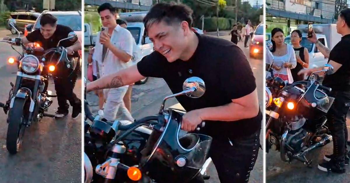 Con su característica sonrisa y con actitud carismática, el artista enfrentó con humor el hecho que tuvo que empujar su motocicleta para llegar hasta la estación de servicio.
