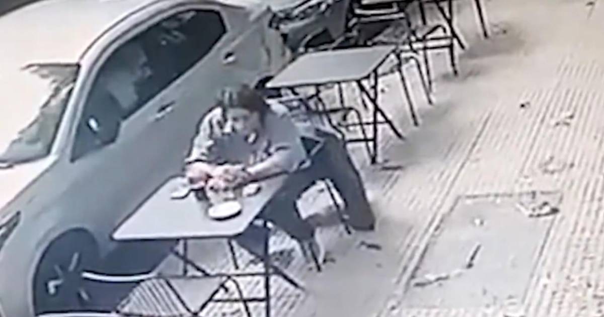 Las imágenes de las cámaras de seguridad muestran que el hombre estaba sentado afuera de la cafetería, disfrutando de su merienda sin percatarse que sería impactado por un vidrio que cayó desde el cuarto piso y le llegó a ocasionar lecciones en su cabeza y brazo.