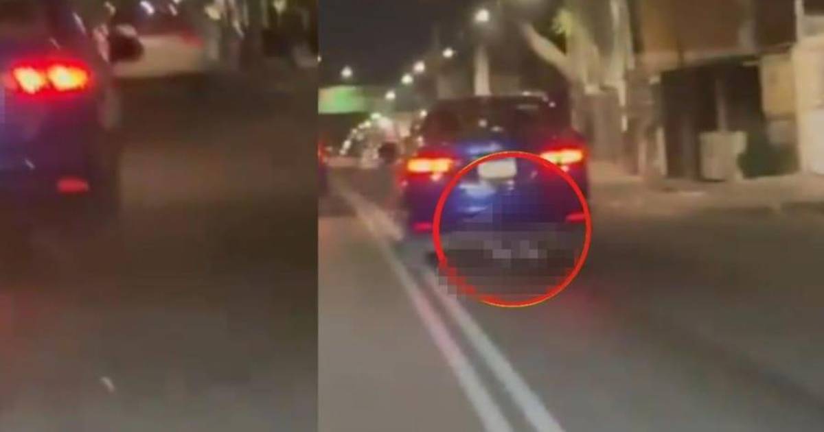 En las imágenes se observa las piernas del hombre debajo de un auto que avanza a fuerte velocidad, en lo que parece ser una fuga.