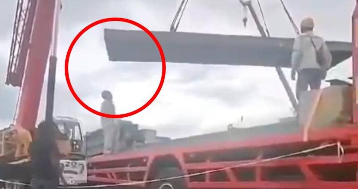 En el video se observa que el hombre estaba sobre el camión, donde se iban a colocar las planchas de hierro. Estaba dando indicaciones a la grúa cuando de repente las planchas caen sobre el trabajador.