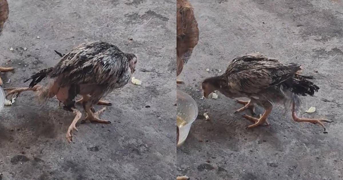 En el video se observa al animal alimentándose junto a otros pollos, caminando de un lado al otro con dos de sus patas. Aparentemente las otras dos están inmovilizadas, por lo que se puede ver en el video.