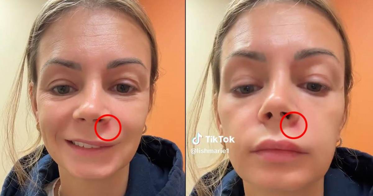 Todo comenzó un día cuando la joven identificada en TikTok como @lishmarie1, notó un grano debajo de una de sus fosas nasales, en el área comprendida entre la boca y el puente nasal, conocida entre médicos como el “triángulo de la muerte”.