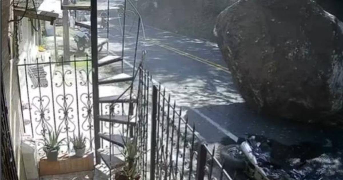 Imágenes de una cámara de seguridad, captaron el momento en que una roca gigante impactó sobre la motocicleta de un conductor que se había estacionado a conversar afuera de una vivienda con una persona.