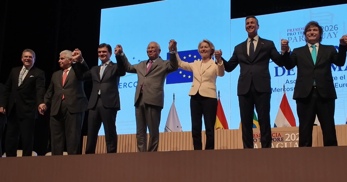 Von der Leyen, Costa, los presidentes de Argentina, Uruguay y Paraguay y el canciller de Brasil, acompañados de mandatarios de países asociados al bloque sureño, terminaron la ceremonia con una ovación y una foto grupal en el auditorio del Banco Central de Paraguay.