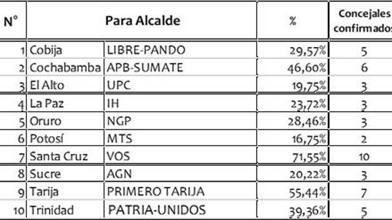 Otro caso son las Alcaldías, cuyos ganadores son elegidos en primera vuelta, y cuyo espacio de victoria va desde el 71,55 % de Manuel Saavedra con VOS en Santa Cruz de la Sierra (superior a cualquier otra elección en Bolivia, incluidas las votaciones por el legendario Percy Fernández) hasta el pírrico el 16,75 % de MTS en Potosí, aunque en miembros de los Concejos Municipales a varios los beneficia la distribución d’Hondt que emplea el sistema electoral boliviano; así aseguraron su gobernabilidad VOS que tiene 10 concejales de 11 posibles (una mayoría más que absoluta que le permitirá desarrollar su programa y promesas), PRIMERO TARIJA con siete y APB-SÚMATE (Cochabamba) con seis, quedando por debajo de esas cifras LIBRE-PANDO y PATRIA-UNIDOS (éste en Tarija), ambos con cinco concejales, mientras que en El Alto, La Paz, Oruro y Sucre los Alcaldes electos sólo serán acompañados por tres concejales (UPC, IH, NGP y AGN, respectivamente); menos gobernable aun queda la ciudad de Potosí en la que el ganador, MTS, sólo obtuvo dos concejales.
