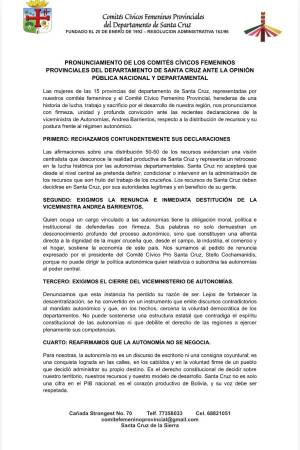 De igual forma, a través de un pronunciamiento los Comités Cívicos Femeninos Provinciales de las 15 Provincias de Santa Cruz rechazaron las declaraciones de la viceministra de Autonomías, Andrea Barrientos. Asimismo, exigen la renuncia y e inmediata destitución de su cargo.