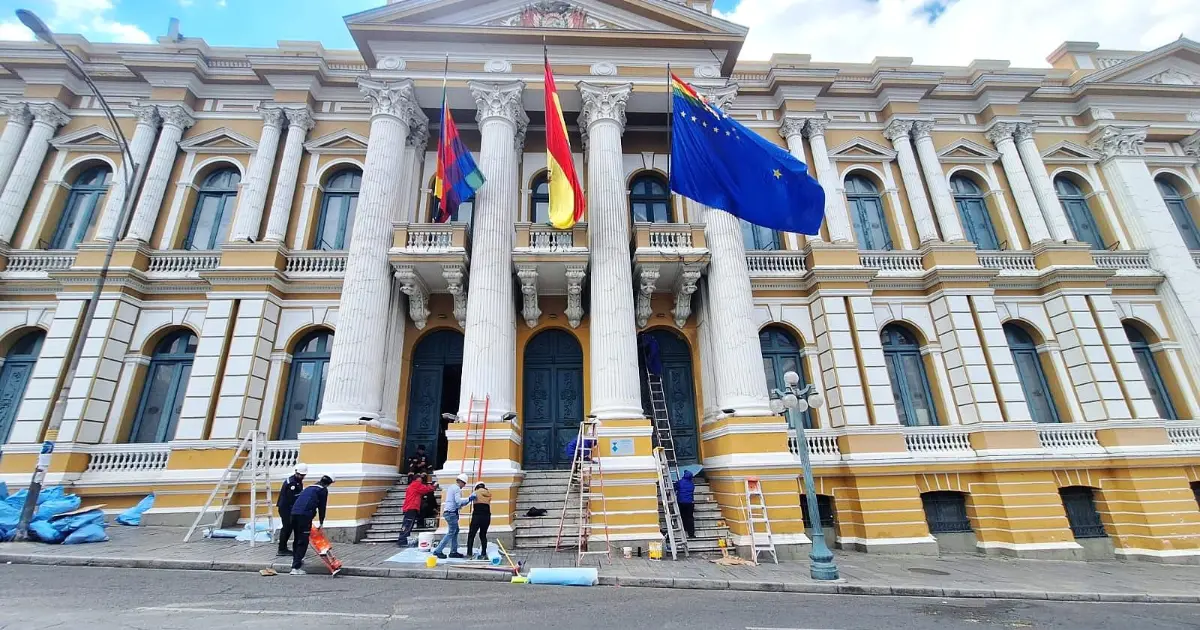 A seis días de los actos protocolares, un ejército de obreros remoza la plaza Murilllo y los edificios de los órganos Legislativo y Ejecutivo, el centro del poder político de Bolivia.