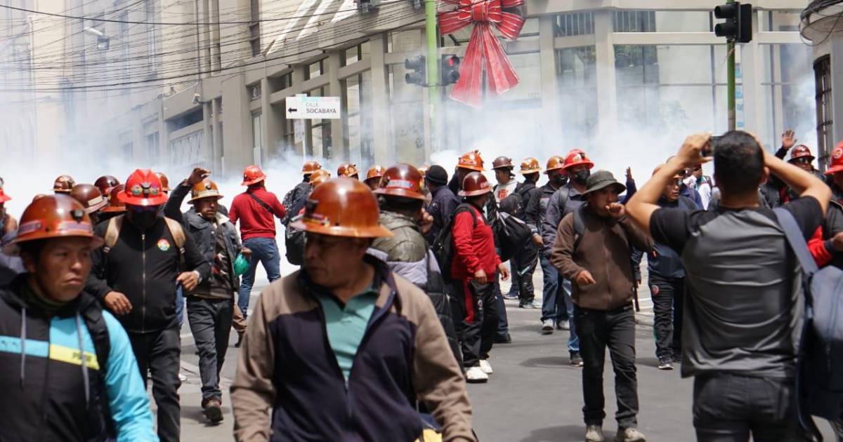 El sector aurífero llegó al encuentro luego de una movilización marcada por enfrentamientos con efectivos policiales que resguardaban la plaza Murillo. Durante los incidentes, los movilizados utilizaron y lanzaron artefactos explosivos a pocos metros de la barricada policial.