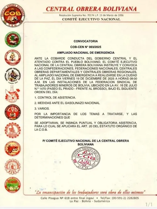 La Central Obrera Boliviana (COB) ha convocado a un “ampliado de emergencia” para este viernes en La Paz en el cual analizar y definirán medidas contra la eliminación de la subvención de los combustibles que dispuso el Gobierno de Rodrigo Paz.